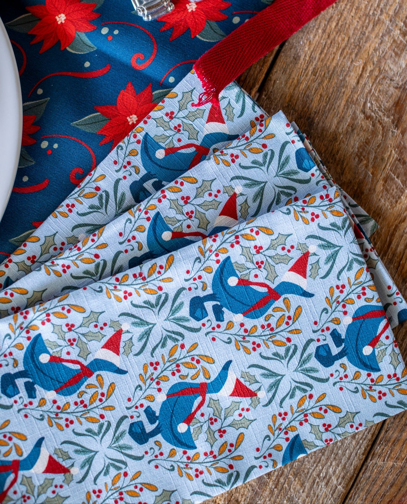 These festive napkins bring a touch of whimsy to your holiday table. Made from 100% cotton slub, they add both elegance and fun to your family gatherings with their charming "Duck the Halls" design.