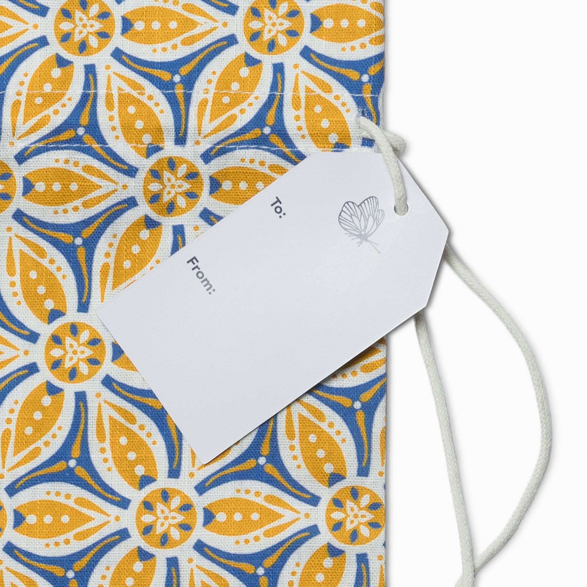 Sized to fit a standard wine bottle (6" x 13.75"), it cinches closed with a cotton drawstring and includes an attached “to/from” tag for easy, waste-free gifting. Just add wine—no wrapping required.