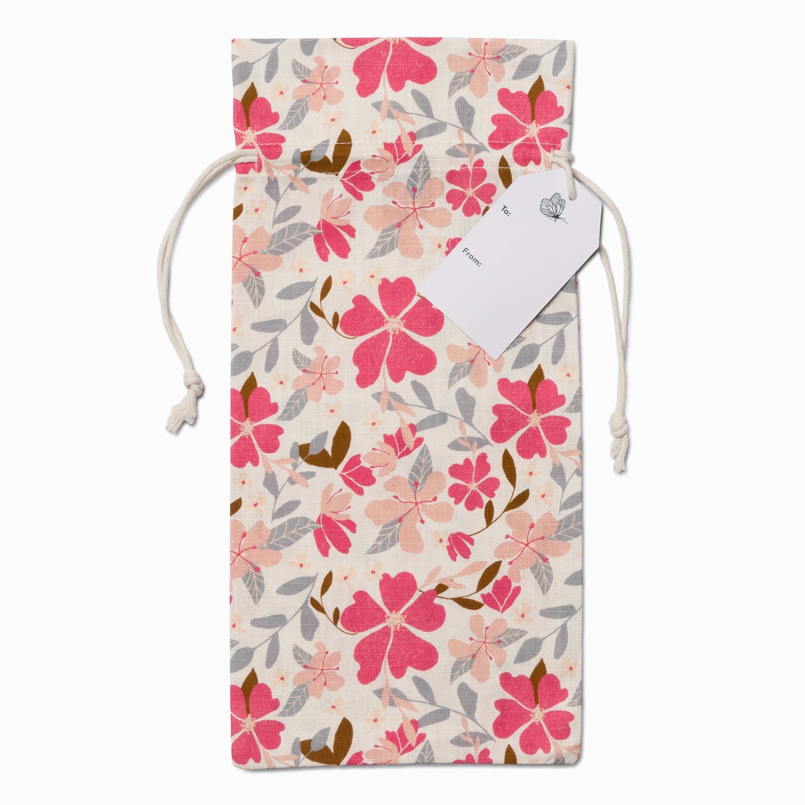 Sized to fit a standard wine bottle (6" x 13.75"), it cinches closed with a cotton drawstring and includes an attached “to/from” tag for easy, waste-free gifting. Just add wine—no wrapping required.